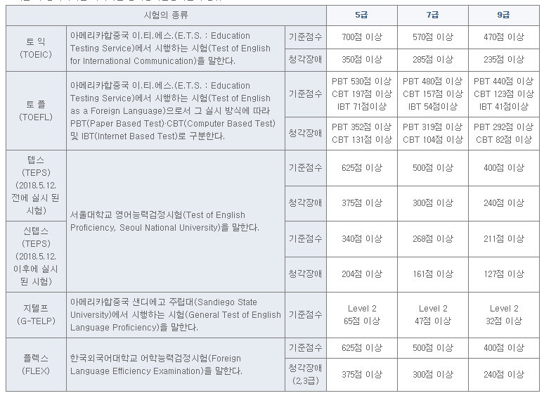 - 토익(TOEIC): 7급 – 570점 이상 / 9급 – 470점 이상