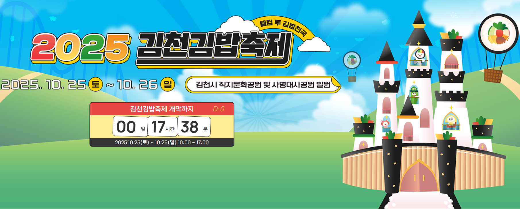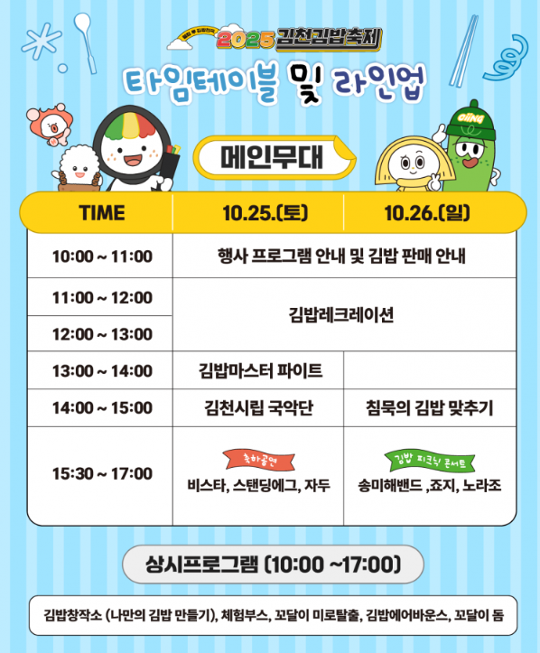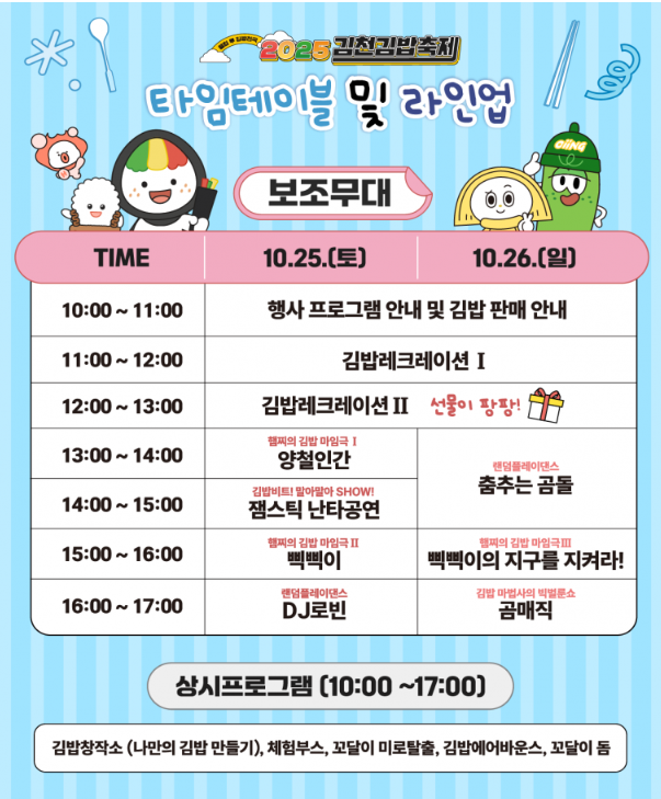이번 축제는 10월 25일(토)부터 26일(일)까지 이틀간 진행됩니다. 보통 오전 10시부터 다양한 김밥 부스와 공연, 체험 행사들이 운영되며, 저녁까지 풍성한 프로그램이 이어질 예정입니다.