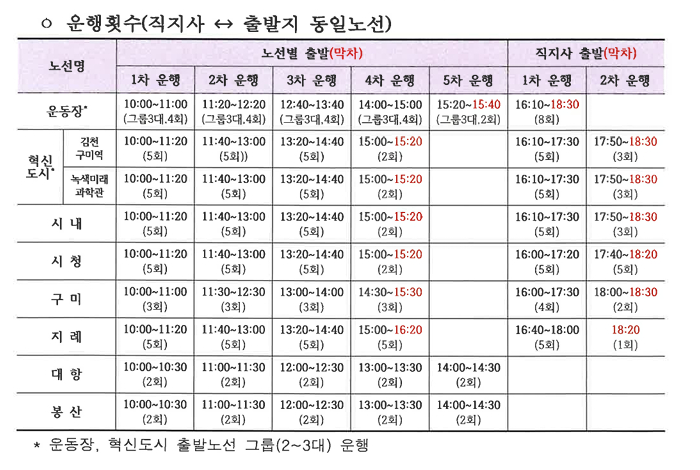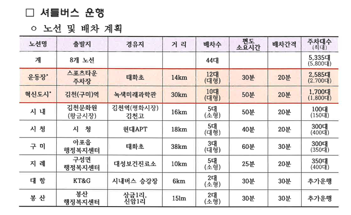 총 40대의 셔틀버스가 8개 노선으로 배치되어, KTX 김천(구미)역, 혁신도시, 스포츠타운 등에서 접근이 가능합니다.