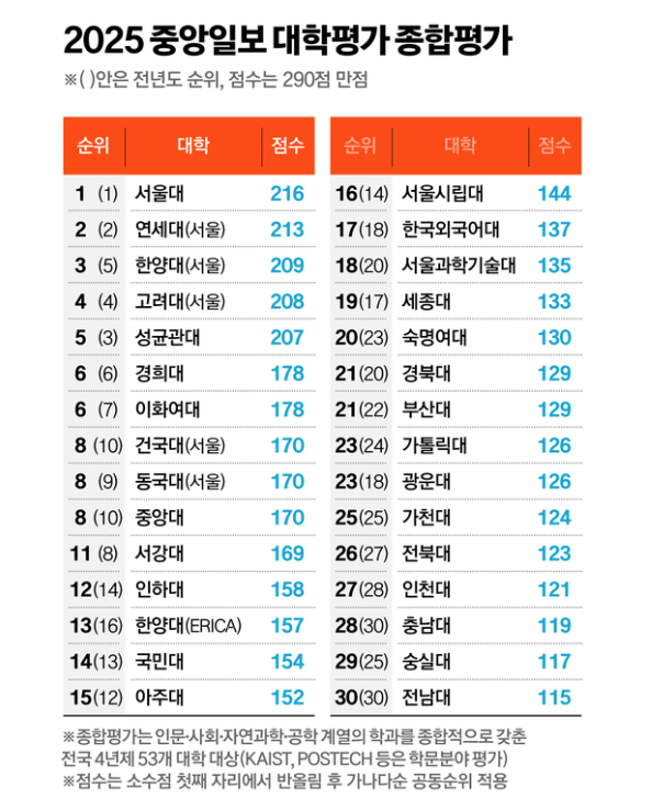 2025 중앙일보 대학평가순위 공개! 서울대 10년 연속 1위, 한양대 급상승! 인서울 대학 순위부터 지거국까지 한눈에 정리된 대학 순위 총정리. 수험생과 학부모 필독 정보!