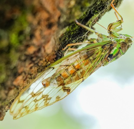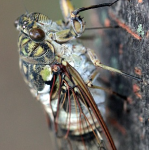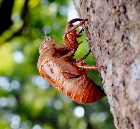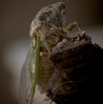 - 투명한 연갈색 성충이 천천히 몸을 빼내며 날개를 펼침